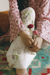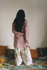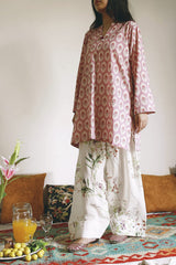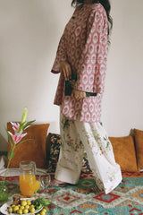 The set pairs a printed kurta in muted rose tones with a botanical wide-leg shalwar, creating an effortlessly graceful everyday look rooted in nature and nostalgia.