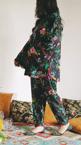 Trims: Finished with contrasting pink lace on sleeves, hem, and trouser cuffs