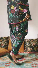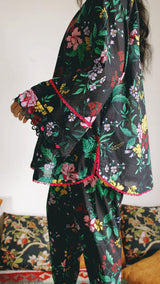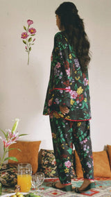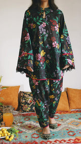 A bold black 2-piece co-ord set with multicolor floral print, crafted in soft lawn. The kurta features flared sleeves, delicate lace edging, and a front keyhole neckline.