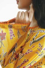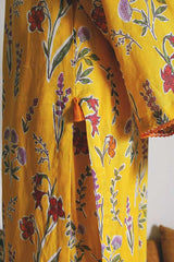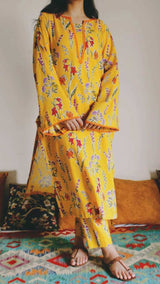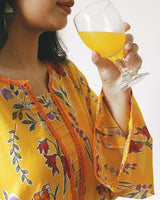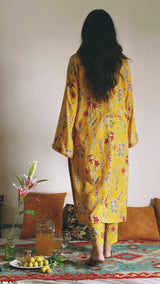 A mustard yellow 2-piece kurta set featuring floral prints in red, purple, and green. Designed with a relaxed A-line cut, wide sleeves, and a delicate neckline.