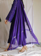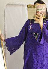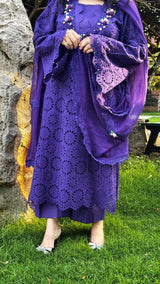 Step into timeless elegance with this rich violet chikan kari lawn ensemble, delicately embroidered and thoughtfully handcrafted. Made from breathable yet luxe lawn fabric, the outfit features intricate chikan kari cutwork embroidery that gives it both texture and charm — perfect for warmer days and festive evenings alike.